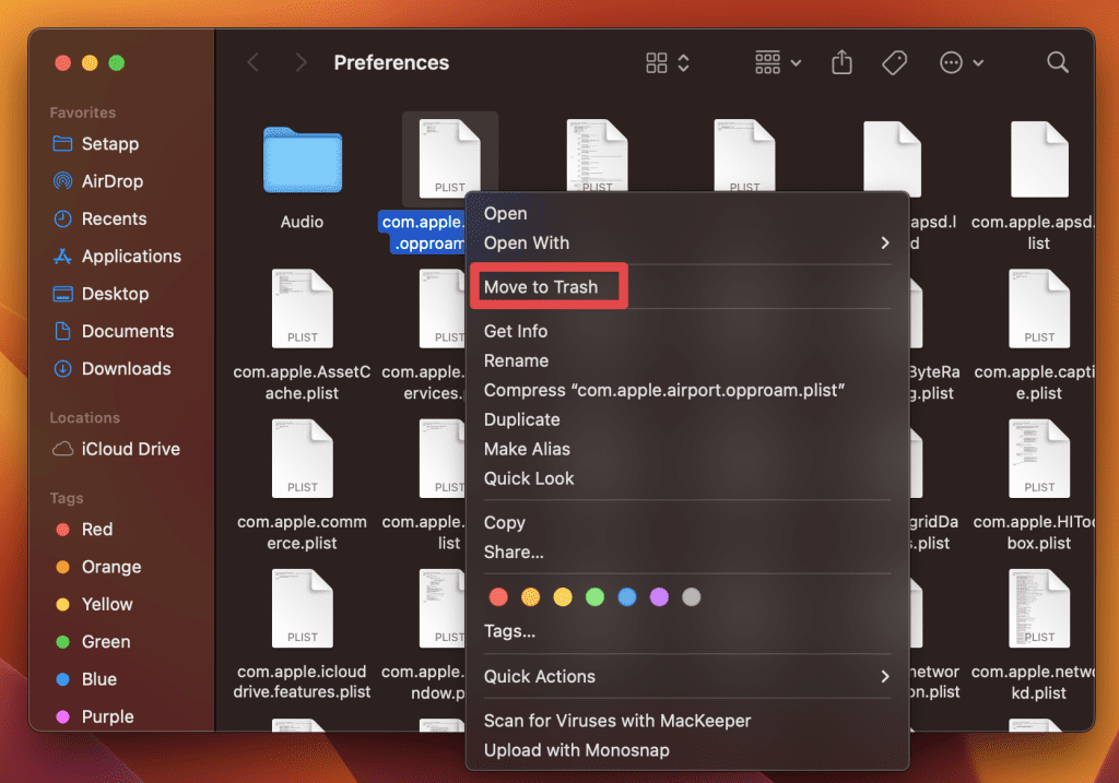 - 选择相关的 .plist 文件并将它们拖到 Bin 中。或者,右键单击文件并选择移至垃圾箱从上下文菜单中。