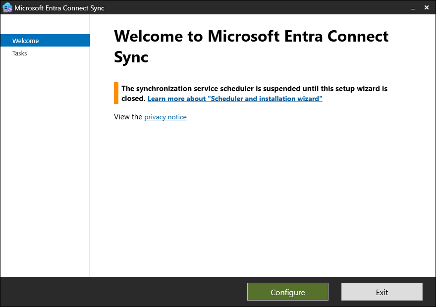 - 验证欢迎来到Microsoft Entra Connect Sync屏幕出现。