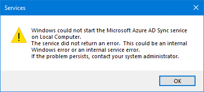 在Windows服务中启动Microsoft Azure AD同步服务时,您会收到错误: