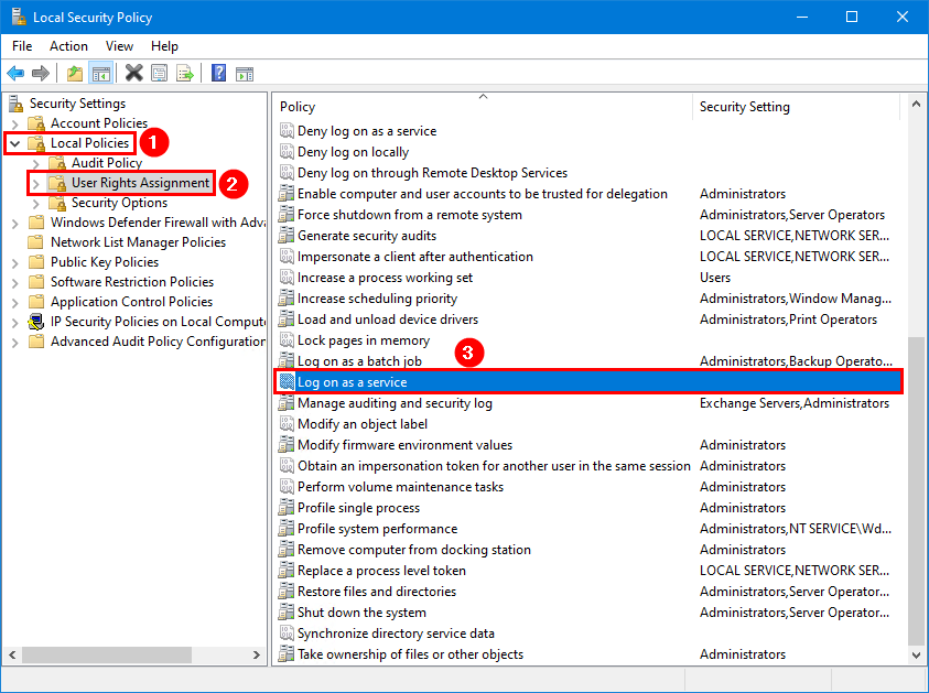 将“登录为服务登录”到该计算机上的服务帐户。您可以使用本地安全设置(secpol.msc)来执行此操作。如果该计算机是集群中的节点,请检查该用户权利是否已分配给集群中所有节点的群集服务帐户。