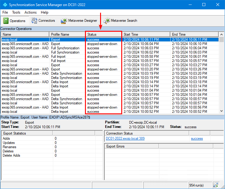 返回 Microsoft Entra Connect Sync 服务器并验证状态同步服务管理器。状态显示为成功。