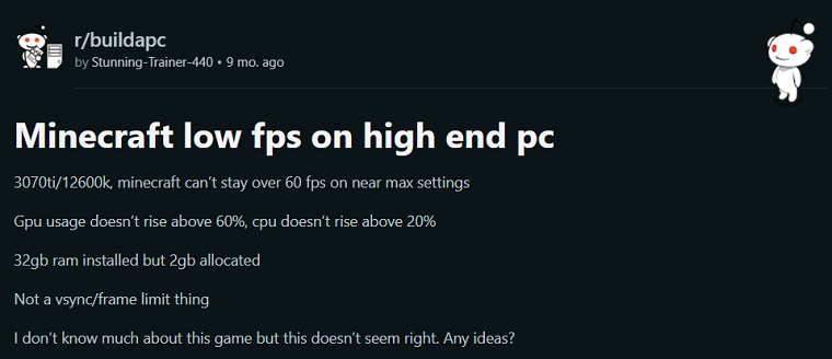 Minecraft球员有成千上万的人,但他们抱怨Minecraft Java版非常不优势。具有高端系统运行最新CPU和高端GPU(如RTX 3070 TI和RTX 3090)的玩家抱怨说,尽管拥有高端的FPS个人电脑跑步Windows 10 / Windows 11。