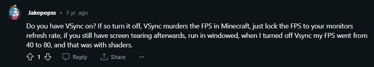 禁用vsync修复高端PC上的Minecraft低FPS根据多个来源。为了实现Vsync禁用后,您可以将FPS锁定在显示屏的刷新率上。