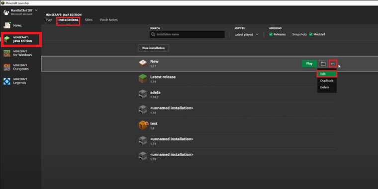 - 单击三个点在您拥有的已安装版本旁边,然后单击编辑。