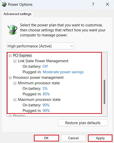 - 两者都设置“已插入”和“用电池”在下面“最大处理器状态”到90-95%取决于你的CPU。