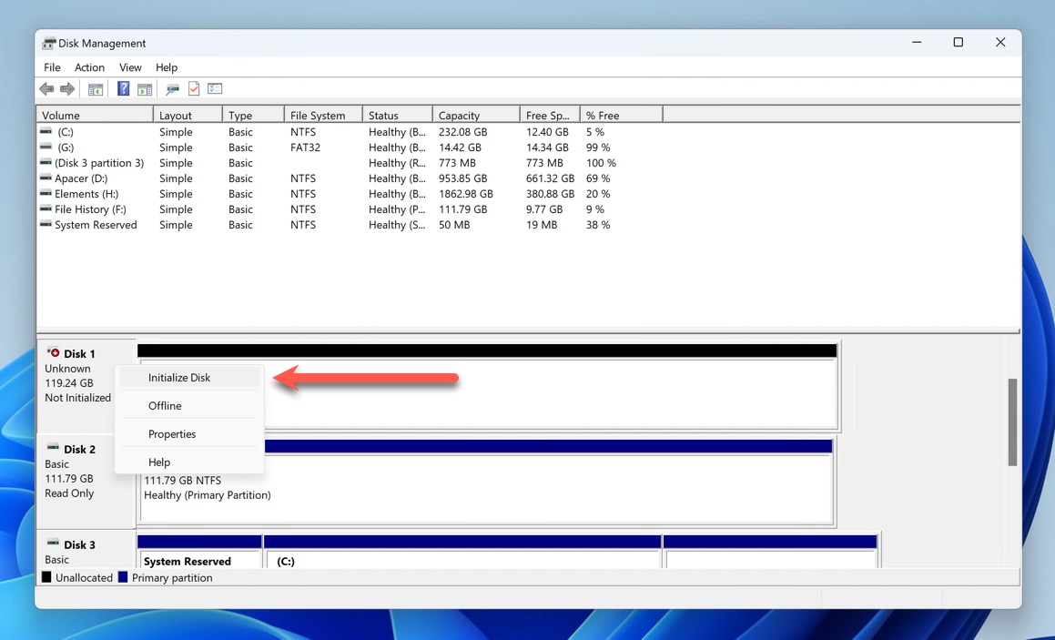 - 如果您决定继续初始化,则可以右键单击 SSD 并选择“初始化磁盘”。请注意,如果当前状态为“离线”,您可能需要首先选择“在线”选项。