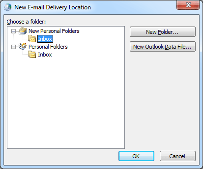 选择不同个人文件夹 (PST) 文件下的收件箱文件夹。如果只有一个 PST 文件,请单击新的 Outlook 数据文件按钮来创建一个新的。然后选择新创建的 PST 文件中的收件箱文件夹。单击“确定”。