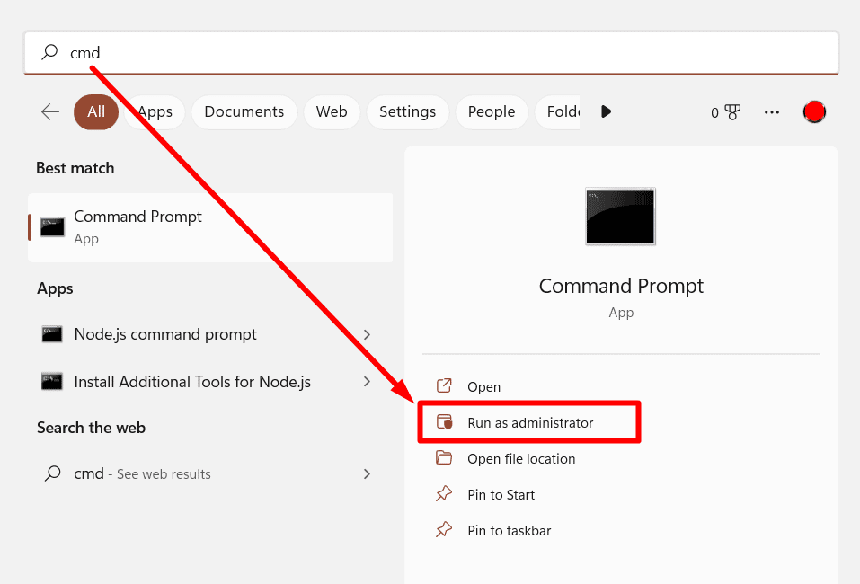 - 类型 ”指令”进入 Windows 搜索栏并选择“以管理员身份运行”选项。CHKDSK 需要此提升的权限才能对磁盘进行更改。