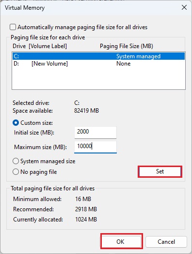 - 现在,选择系统驱动器并键入虚拟内存大小的增加值。