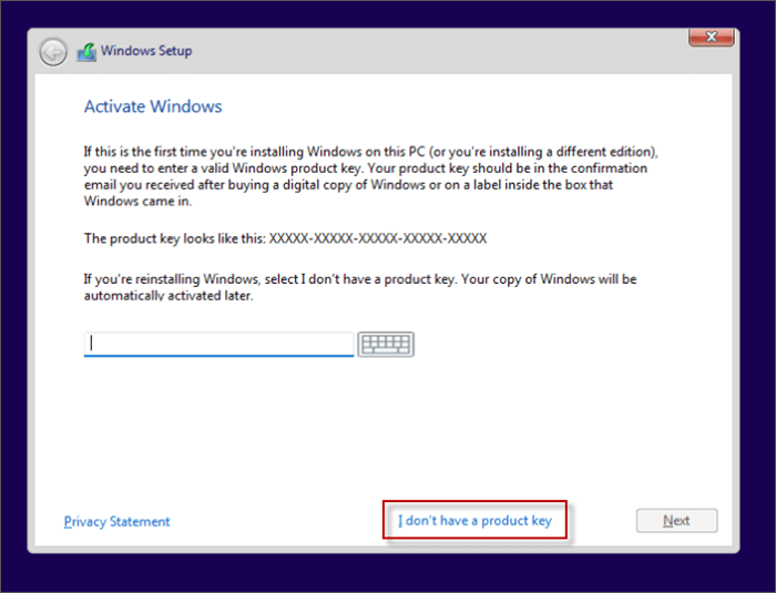 步骤6要激活 Windows,您需要输入许可证密钥。在这里你还可以选择我没有产品密钥安装未激活版本的 Windows,但 Windows 上的某些功能可能会受到限制。