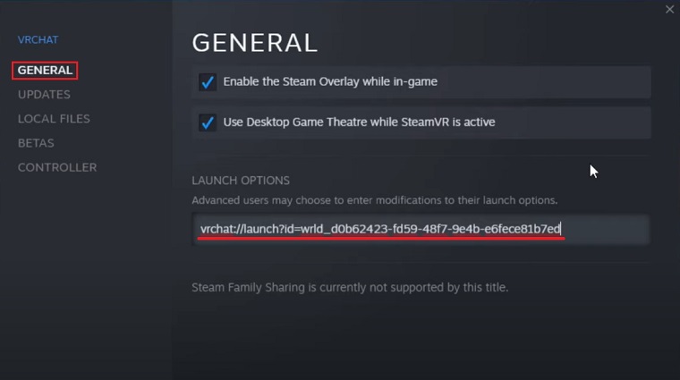 - 在启动选项中栏类型“ vrchat://启动?id = WRLD_D0B62423-FD59-48F7-9E4B-E6FECE81B7ED”。 (没有“”)