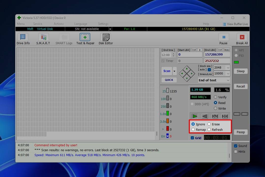 - 扫描完成后,您可以更改扫描操作忽略到重新映射如果发现坏扇区并且您希望将它们重新映射到备用扇区。
