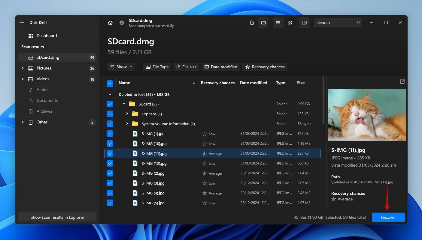 - 选择您要从磁盘恢复的文件,然后单击恢复。
