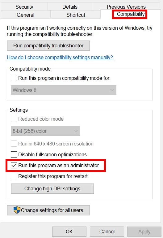 - 去兼容性选项卡>确保点击禁用全屏优化检查它。