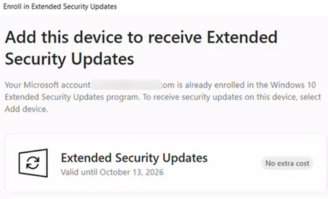 消费者扩展安全更新 (ESU) 订阅链接到 Microsoft 帐户,仅将安全更新延长一年(不超过 2026 年 10 月 13 日),不可续订,并且最多可在与同一 Microsoft 帐户关联的 10 台运行 Windows 10 的计算机上使用。
