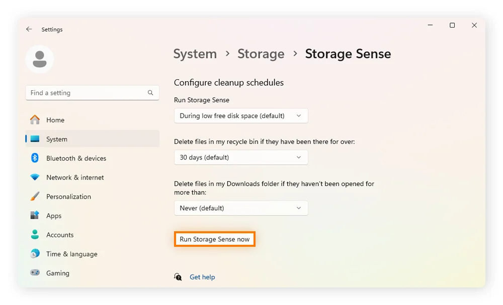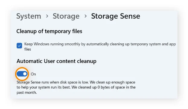 按视窗+我> 前往系统 > 存储 > 配置存储感知或立即运行。打钩删除我的应用程序未使用的临时文件和立即清洁。