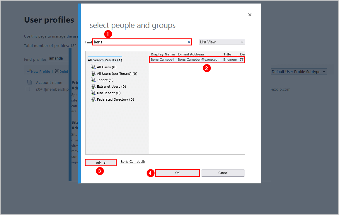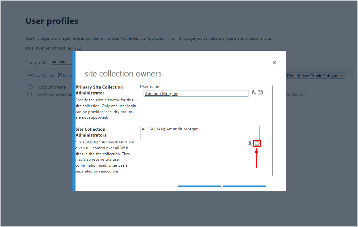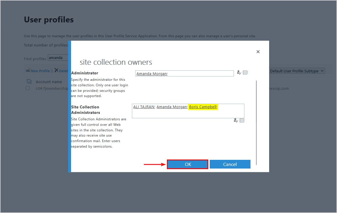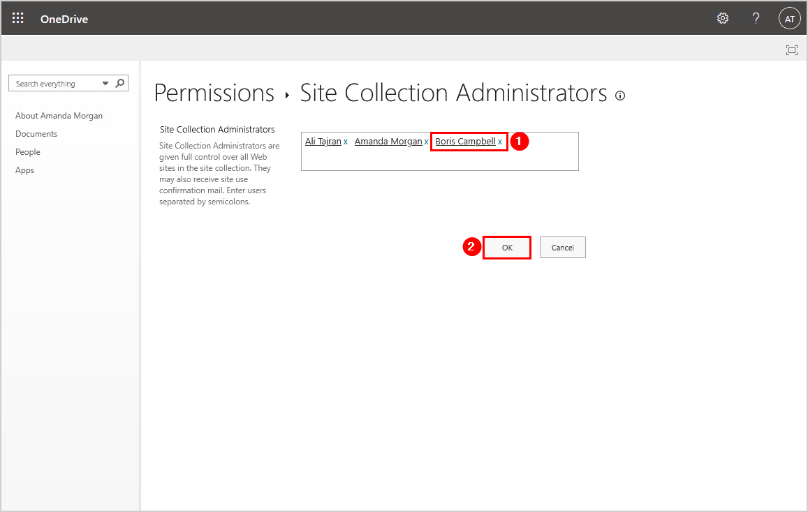 笔记:您要添加的用户或管理员不得被阻止;否则,你将无法找到它们。您可以将多个管理员或用户作为网站集管理员添加到用户的 OneDrive