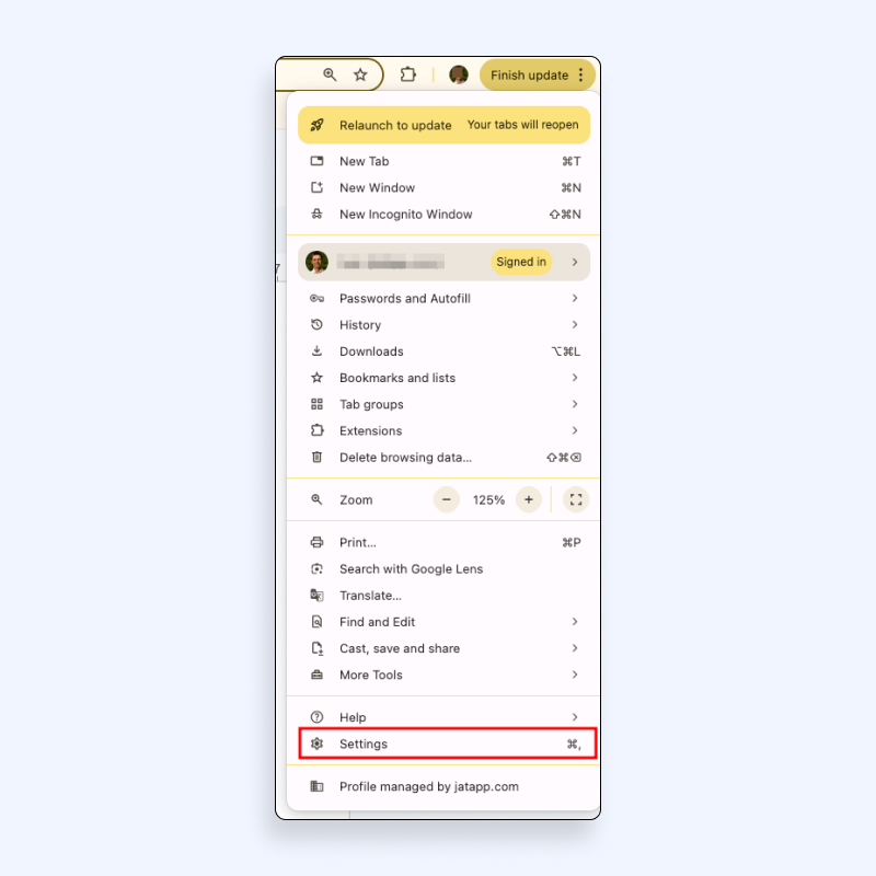 2. 单击“设置”。您将被带到带有 Chrome 设置仪表板的新选项卡。