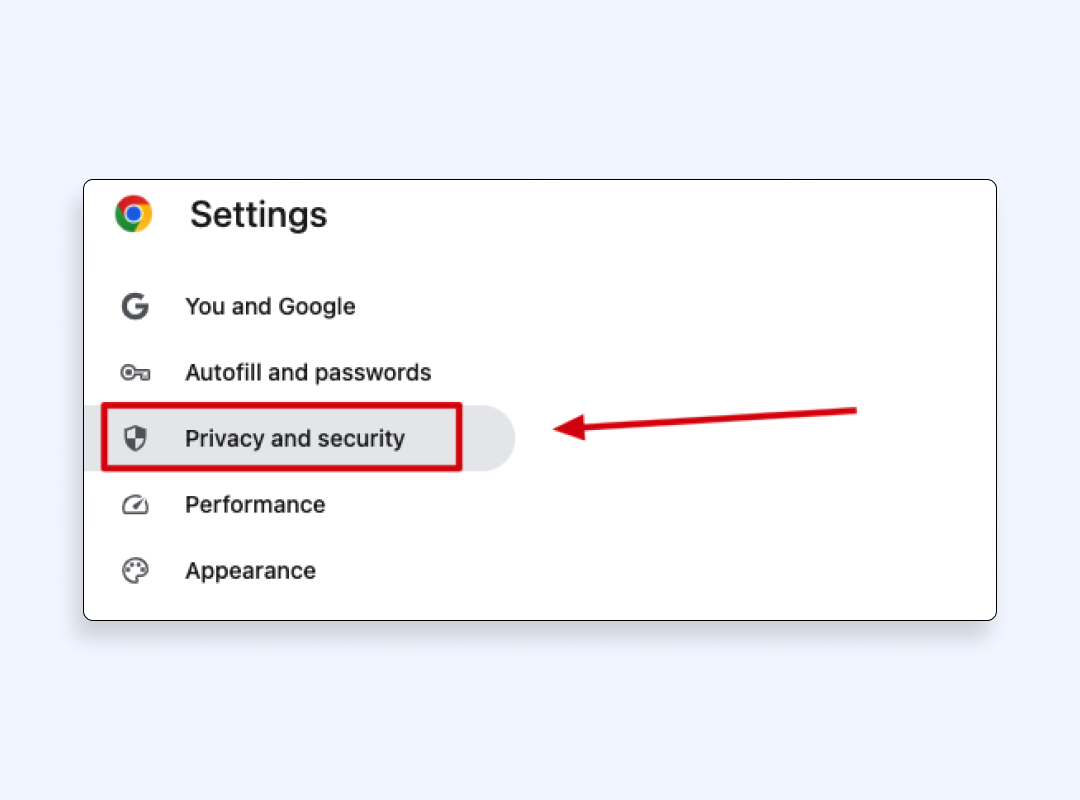 3. 在左侧边栏中,选择“隐私和安全”。 Chrome 在这里保存网站权限、安全设置等信息。
