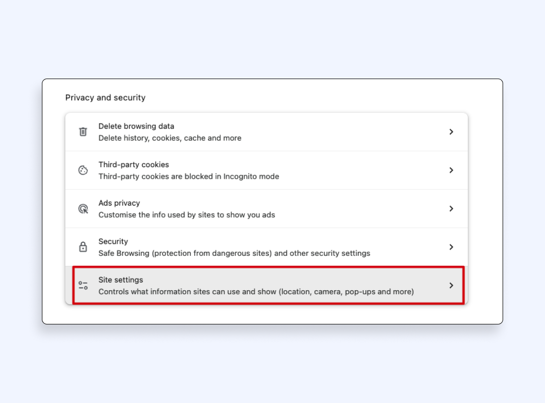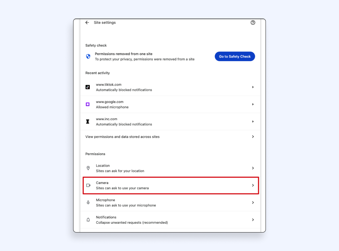 4. 单击“站点设置”。您可以在此处控制网站可以执行的操作,例如访问您的摄像头、麦克风或发送通知。