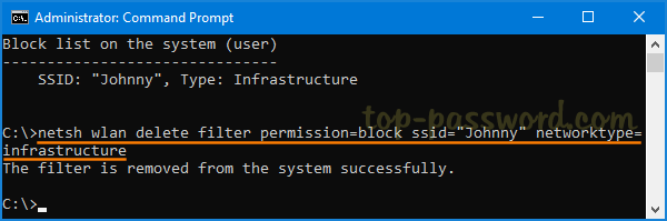 - 要解开隐藏 /阻止的Wi-Fi网络,请执行以下命令将其从阻塞列表中删除。