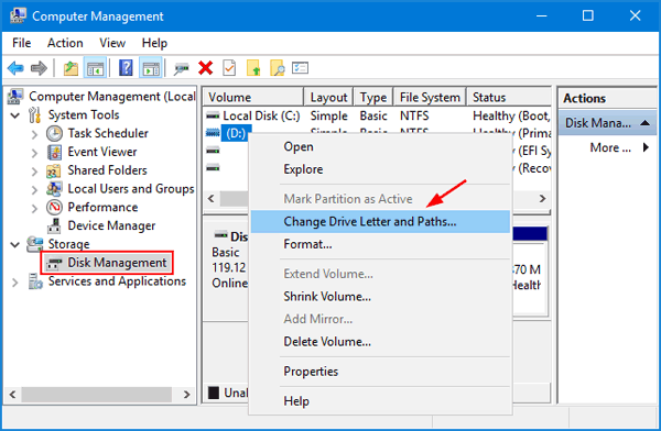- 右键单击要删除驱动器号的分区,然后选择更改驱动器号和路径。