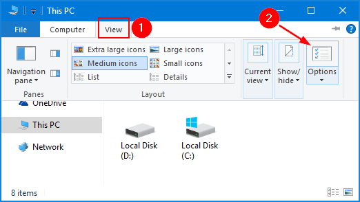 - 打开文件资源管理器,单击看法功能区工具栏中的选项卡,然后单击选项。