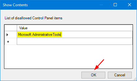 - 输入要隐藏的控制面板项目的规范名称,然后单击好的。例如,如果要限制用户访问管理工具,请在“显示内容”对话框中输入 Microsoft.AdministrativeTools。
