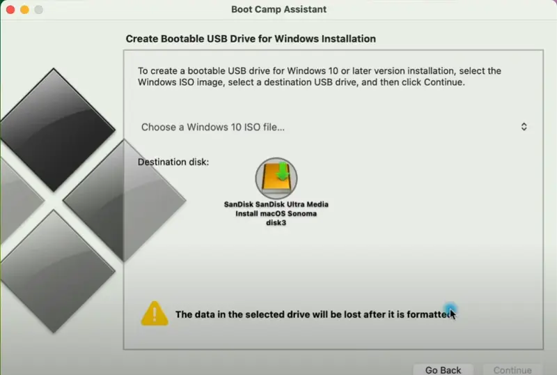 按照屏幕上的说明使用 Windows 11 ISO 文件创建可启动 USB 驱动器(此步骤仅对于某些 Mac 是必要的;较新的型号可能不需要 USB 驱动器)。