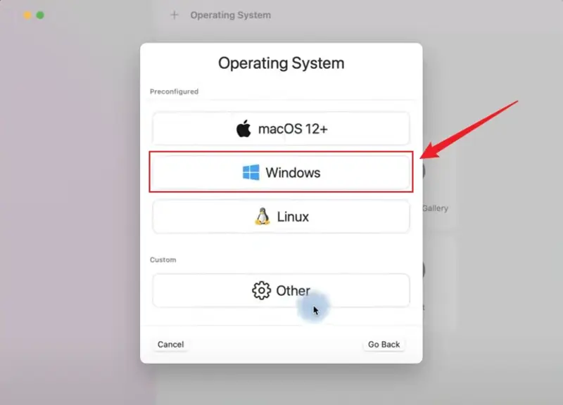 系统:选择“Windows”作为操作系统并选择适当的架构。(导入 thr arm_64 Windows 11 ISO 文件作为启动映像)