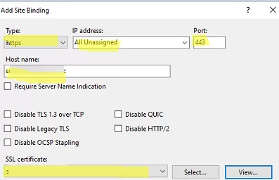 All Unassigned或绑定 SSL 证书的特定 IP 地址(您可以在 IIS Web 服务器的同一端口和 IP 地址上运行多个网站) - 端口号:
