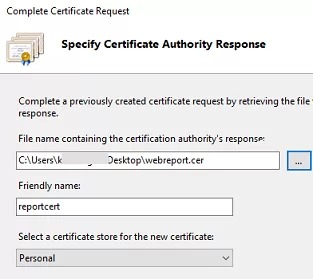 选择包含您从证书颁发机构收到的 SSL 证书的 *.crt 文件。指定 SSL 证书的友好名称以及要放置证书的证书存储(个人或虚拟主机)。