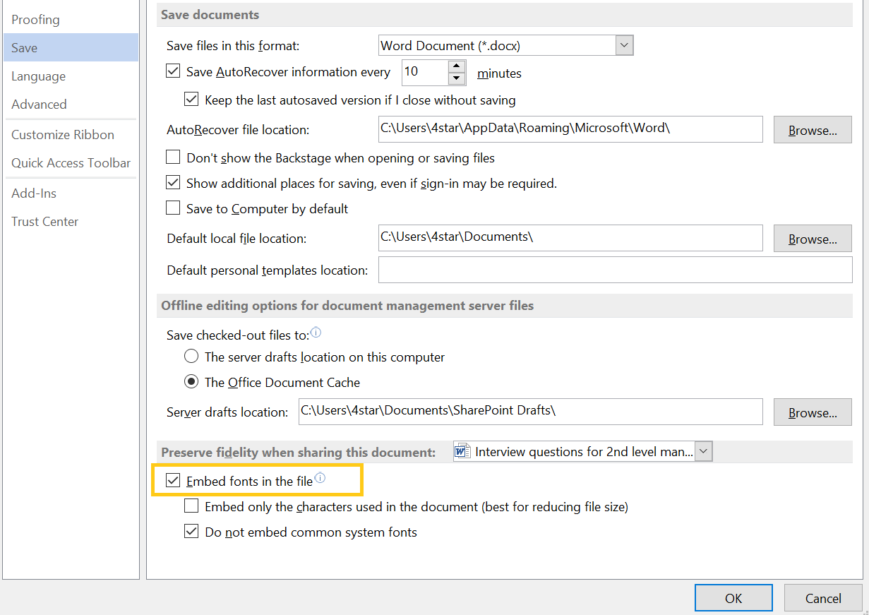 在 Word 或 PowerPoint 文件中解决此问题的一种方法是将字体嵌入到文件中。单击“文件”菜单,选择“选项”,单击“保存”选项卡。选中“在此文件中嵌入字体”旁边的框,然后单击“确定”。
