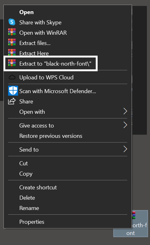 - 右键单击 .ZIP 文件并选择“提取到(字体名称)”。在我的例子中,它是“提取到 black-north-font”。
