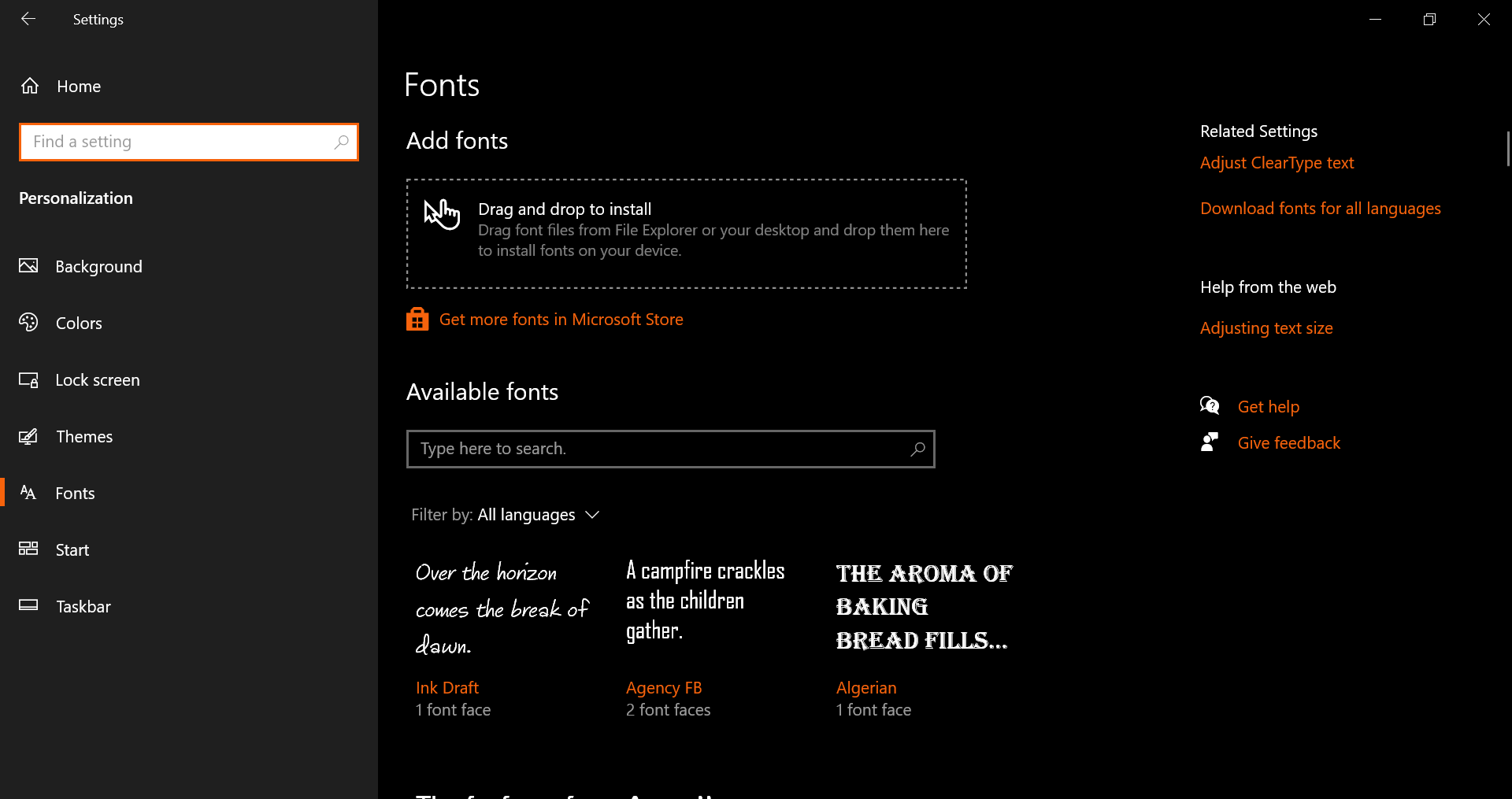 - 前往设置>个性化>字体>在 Microsoft Store 中获取更多字体。