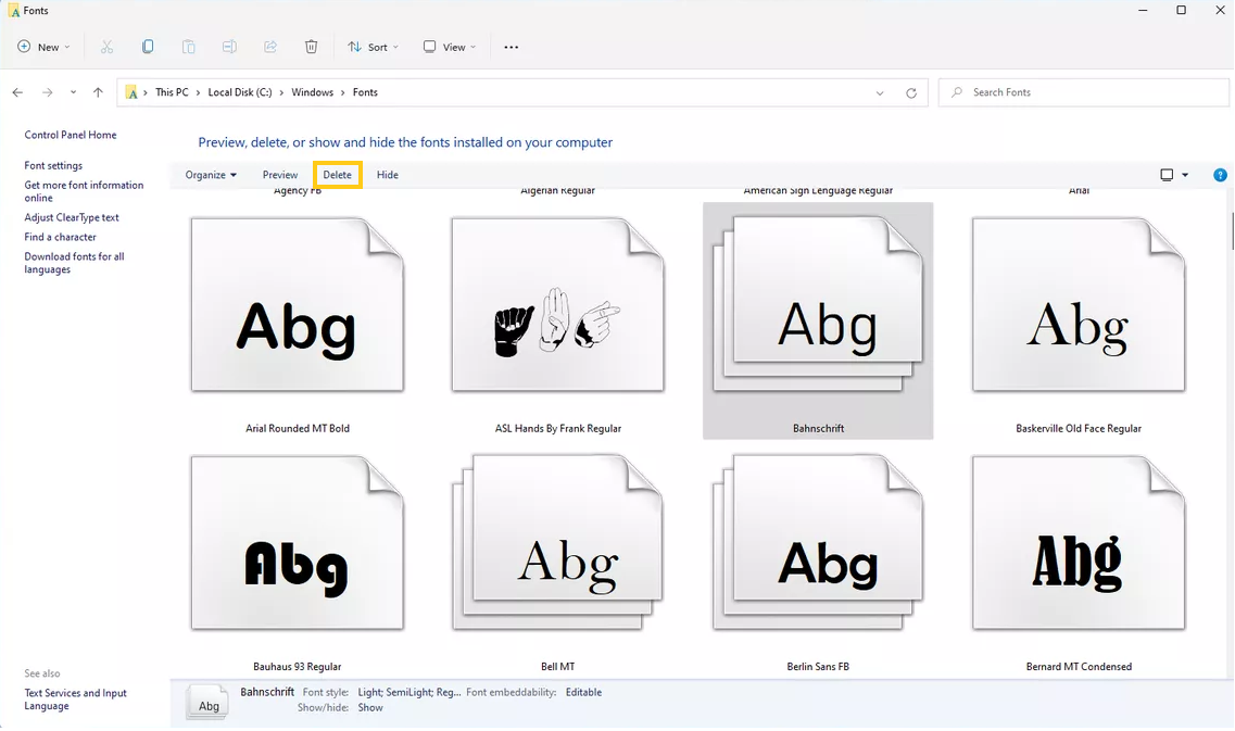 一次删除多种字体的更好方法是在文件资源管理器中访问此路径C:Windows字体。选择要在 Windows 11 中删除的字体,然后从顶部菜单中选择“删除”。以下是卸载字体的方法。