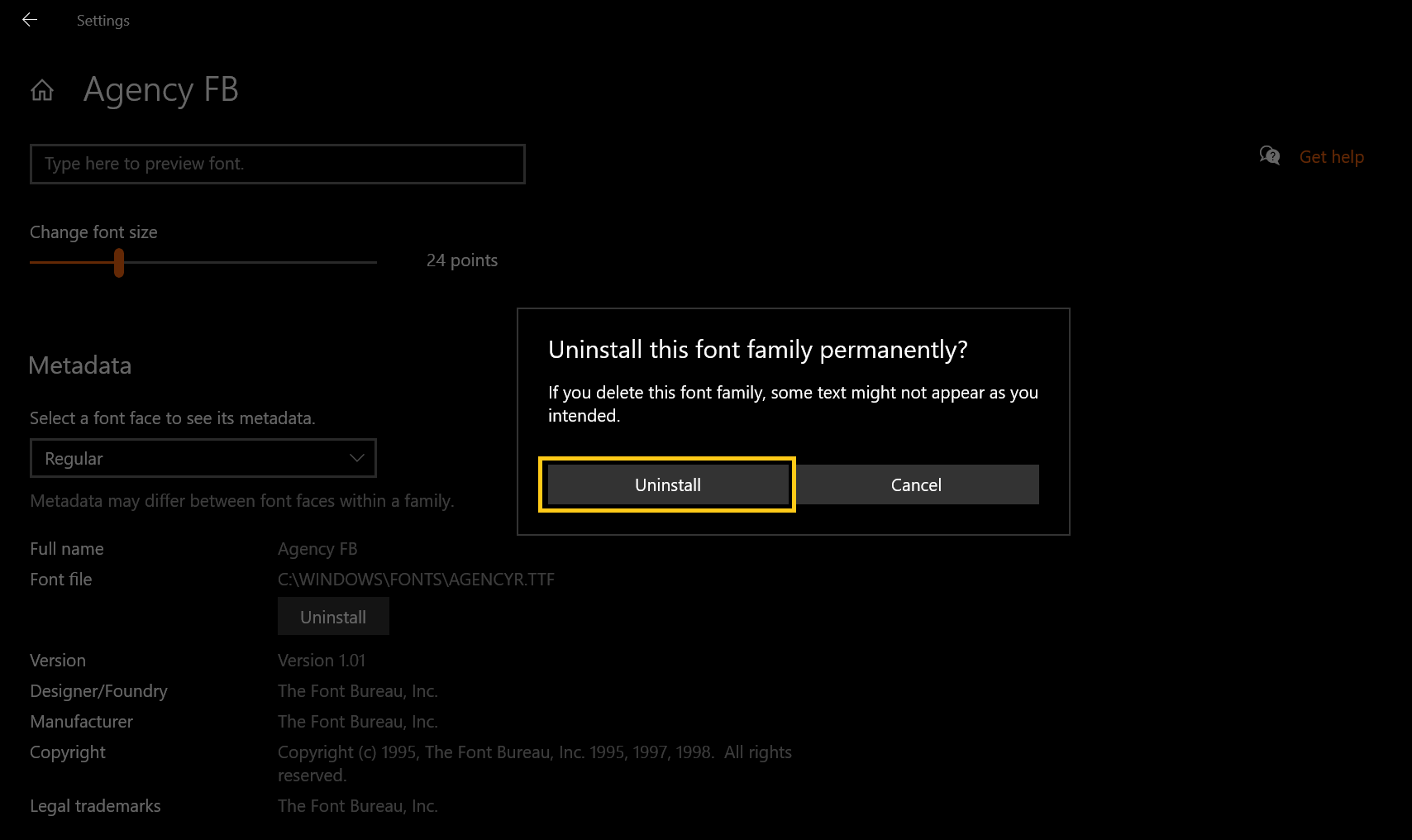 - 在永久卸载此字体系列对话框中,选择卸载。