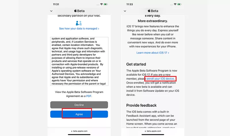 步骤一:在 iPhone 上启动 Safari 并转到beta.apple.com。向下滚动页面至