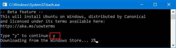 当系统询问您是否要安装 Bash 时,只需键入y并按 Enter 键。 Windows 10 将从 Windows 应用商店下载 Bash 并将其安装到您的计算机上。