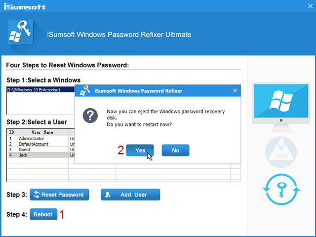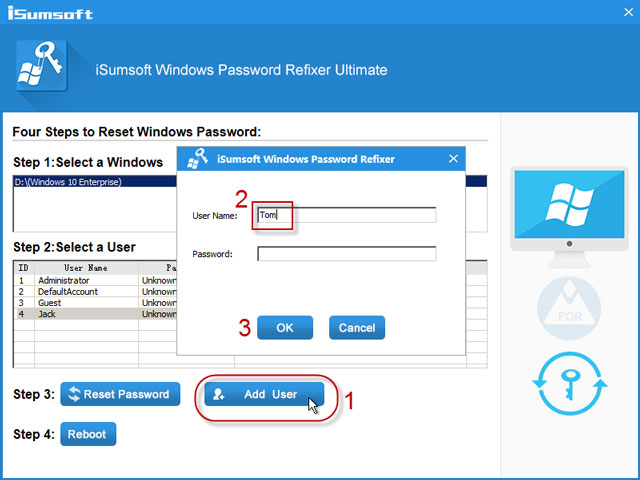 您只需点击添加用户按钮上的Windows 密码修复器屏幕,然后为新用户指定一个名称。这将在此 PC 上创建一个具有管理权限的新用户。添加新的管理员帐户后,您还需要使用以下命令重新启动计算机重新启动按钮。