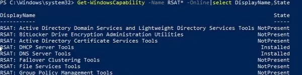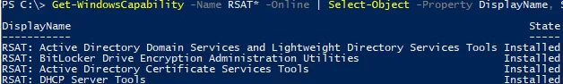 Get-WindowsCapability -Name RSAT* -Online | Select-Object -Property DisplayName, State
