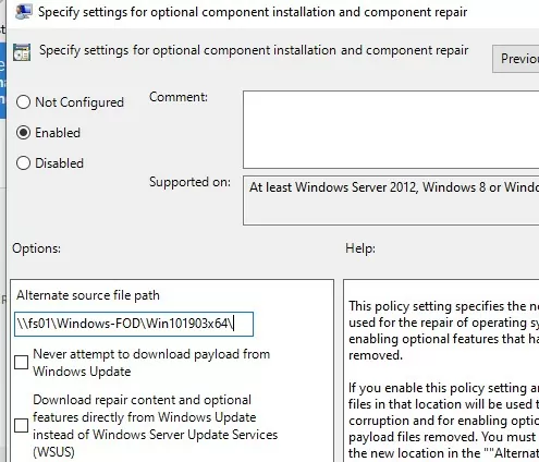 您还可以使用上述组策略选项来指定包含 FoD 图像组件的目录路径。指定包含 FoD 文件的目录的 UNC 路径替代源文件路径范围。