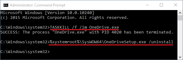 taskkill /f /im OneDrive.exe - 要从 Windows 10 64 位卸载 OneDrive,请发出以下命令: