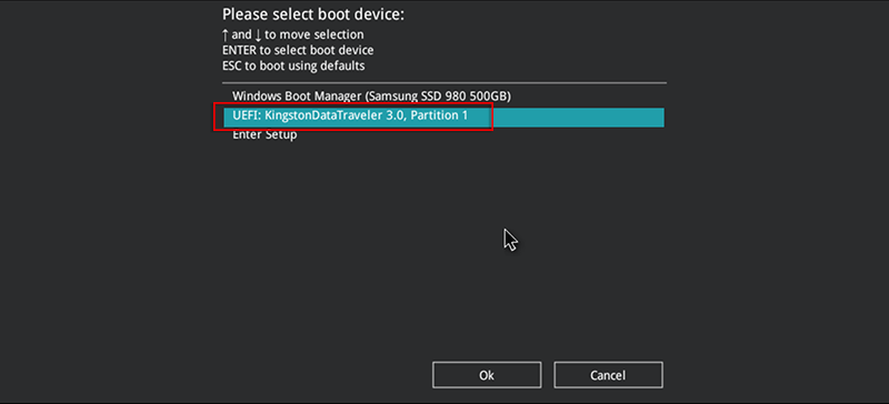 在其中选择 USB 驱动器作为启动设备,然后单击好的。