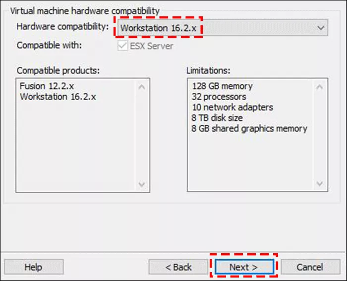 步骤3:选择虚拟机硬件兼容性,然后单击“下一个”。