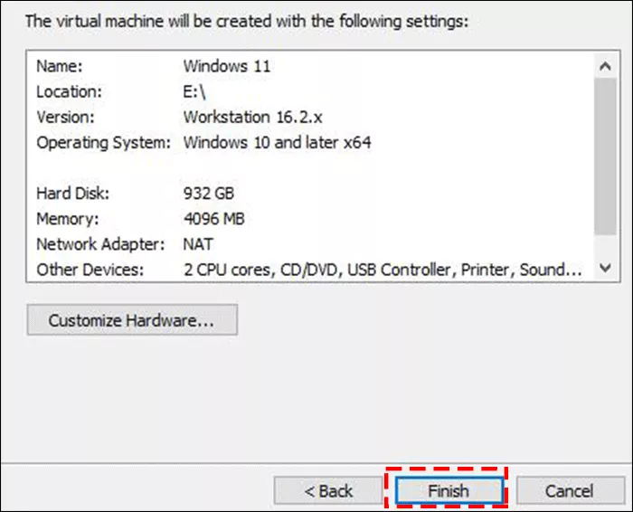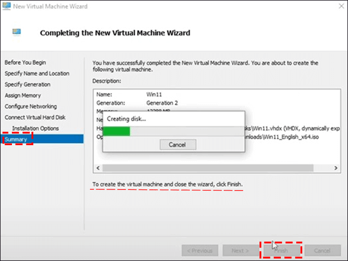 步骤16:现在,单击“结束完成设置后。将使用设置创建虚拟机。