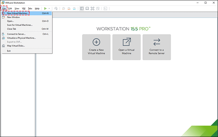 步骤2:现在,您需要创建一个新的虚拟机。在您的PC上打开VMware,然后单击“文件”在左菜单上,然后单击“新的虚拟机”。