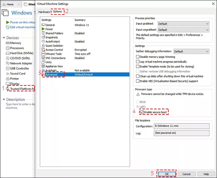 7: 点击 ”受信任的平台模块”,然后单击“选项”。在本节中,单击“先进的“要启用安全启动。最后,单击“”好的“要完成。现在,您可以成功地在此虚拟机上为此供电。
