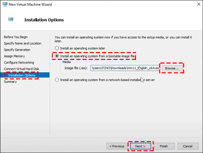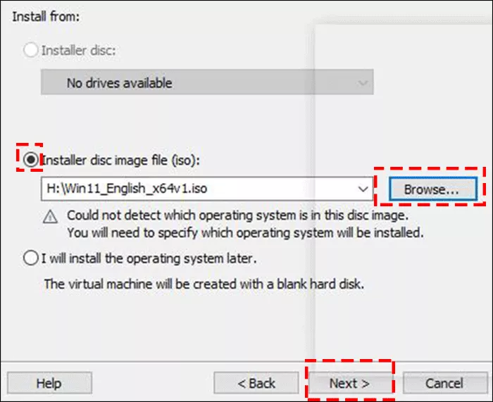 步骤4:单击“安装程序光盘图像文件(ISO)”然后单击“浏览“要选择Windows 11图像文件。之后,单击“”下一个”。
