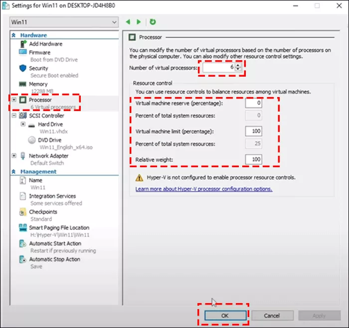步骤11: 点击 ”处理器”左窗格并根据物理计算机上的处理器数量修改虚拟处理器的数量。对于资源控制,您可以使用它来平衡虚拟机之间的资源。之后,单击“”好的”。